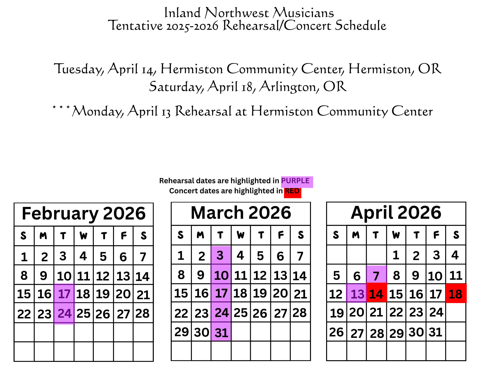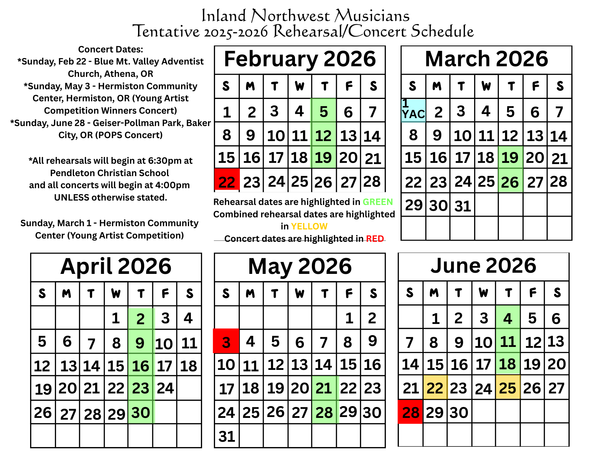 The Inland Northwest Musicians Young Artists Competition will be held on the afternoon of Sunday, March 1st, 2026 at the Hermiston Community Center. This event offers young musicians the opportunity to perform, be adjudicated, receive cash awards, and possibly be selected to perform with the Inland Northwest Orchestra in concert on Sunday, May 3rd, 2026 in Hermiston, OR